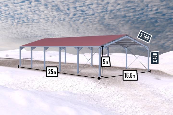Galvanized reinforced building 415m² for heavy snow load